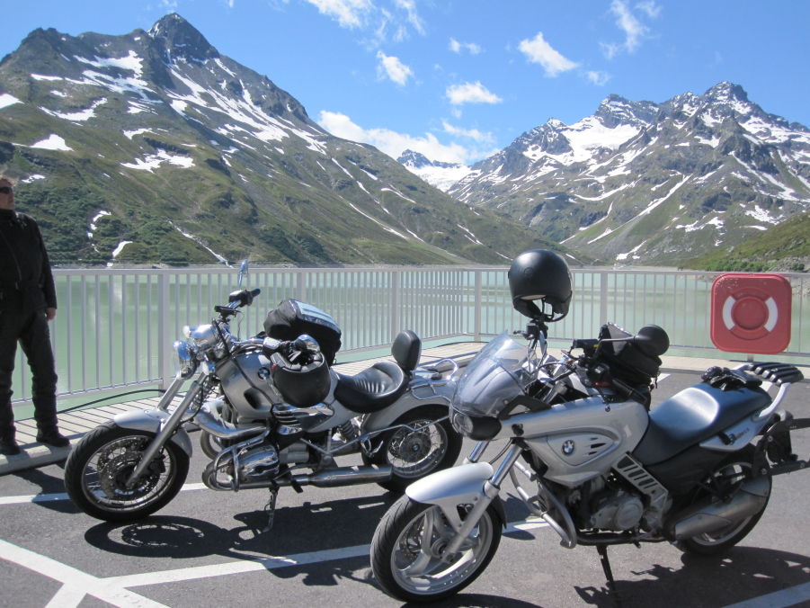 Staumauer, Motorräder vor Panorama