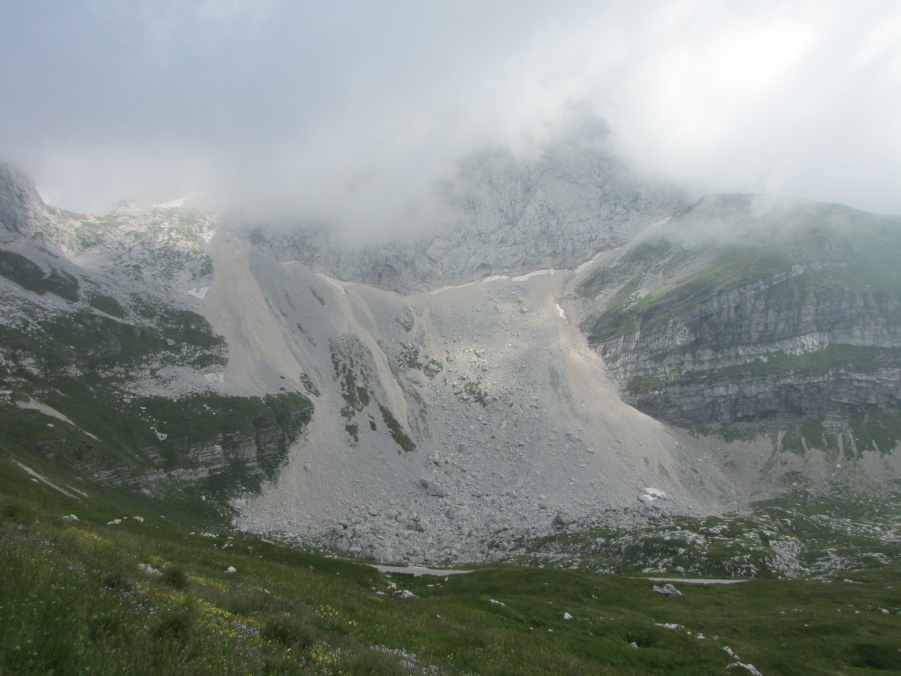 Der Gipfel des Mangart, wolkenverhangen