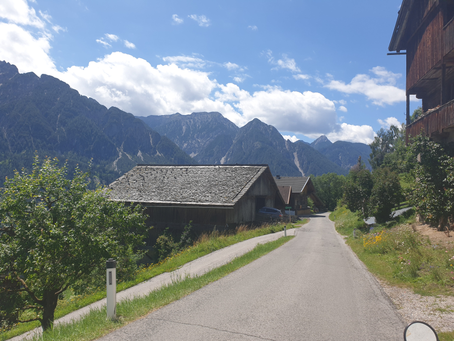 Panorama mit Dohlen auf dem Scheunendach
